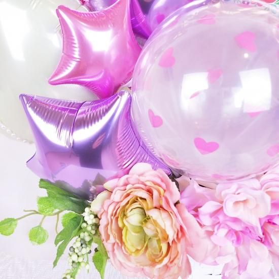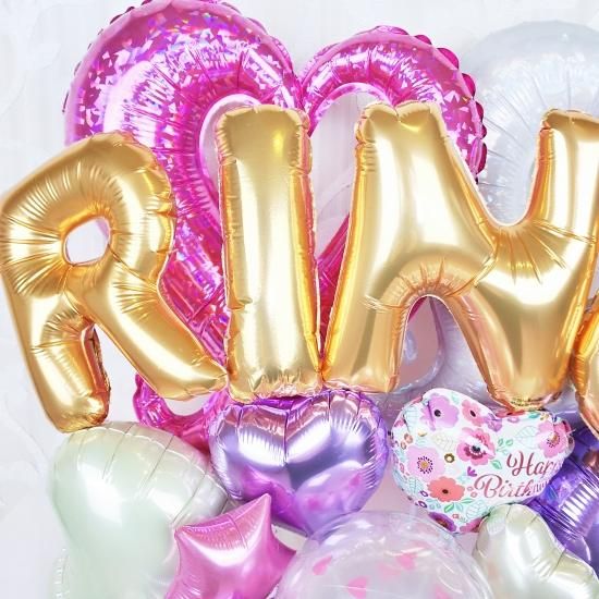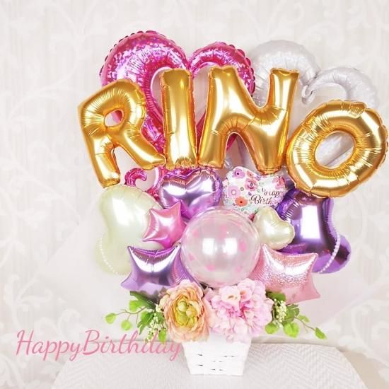 アルファベットバルーンを使用した華やかで大人可愛い置き型アレンジ。