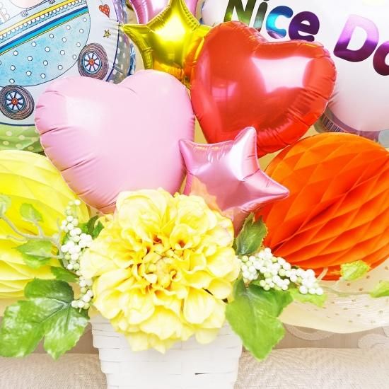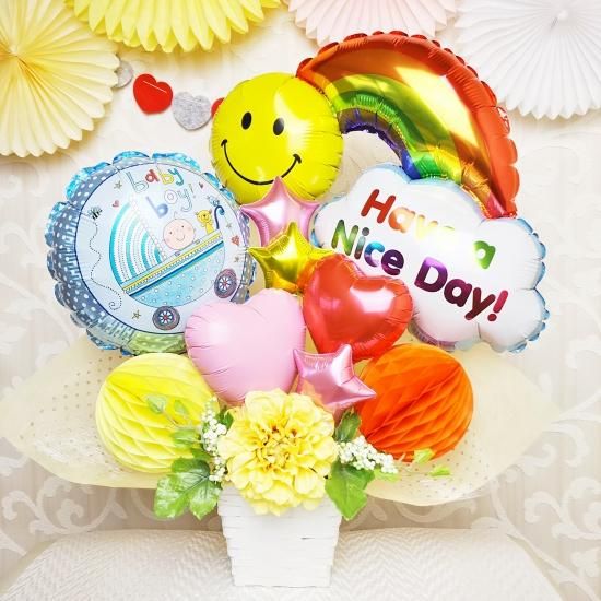 レインボーニコちゃんが印象的な置き型アレンジ♫ハニカムボールとの相性も抜群です。