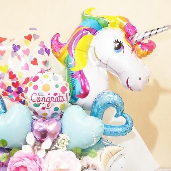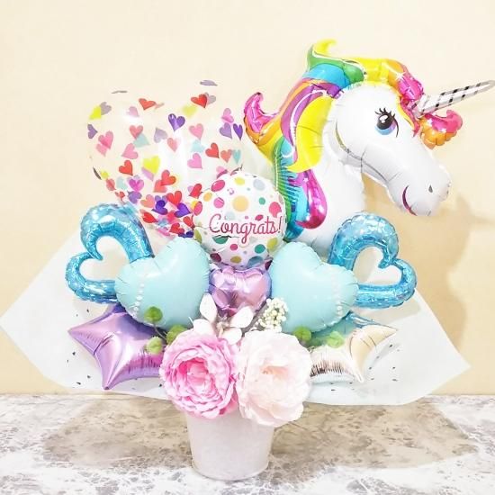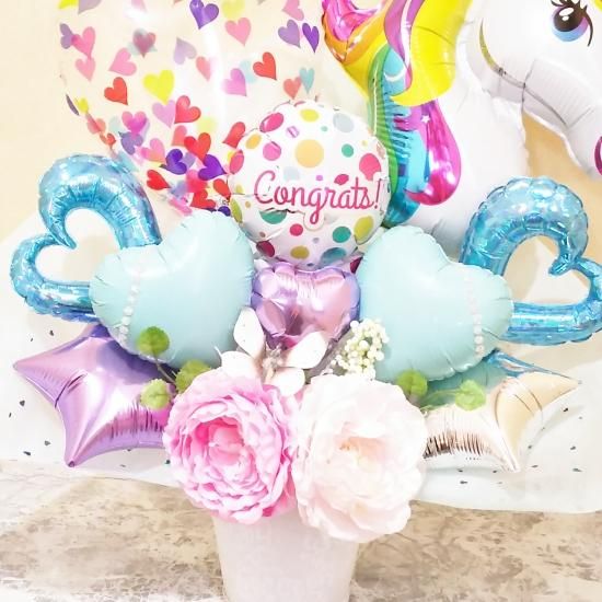 ユニコーン&透明ハート柄のバルーンが可愛い置き型アレンジ♫