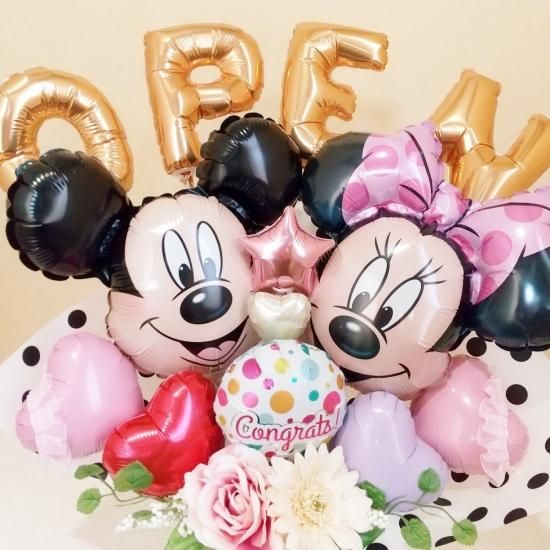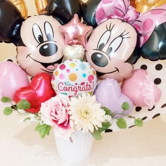 ミッキー&ミニーちゃんの置き型アレンジに浮かぶバルーンがついたDXタイプ♫豪華なプレゼントをお探しの方におすすめです。