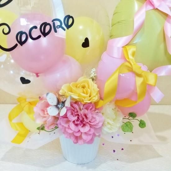 大きなクリアバルーンが目をひく、可愛らしさ抜群の置き型アレンジ♡