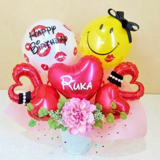 ニコちゃんと、リップ柄のバルーンが可愛い置き型アレンジ♡