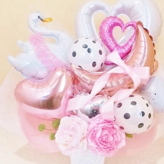 チュチュ姿の可愛いスワン&月のバルーンが印象的な置き型アレンジ♡